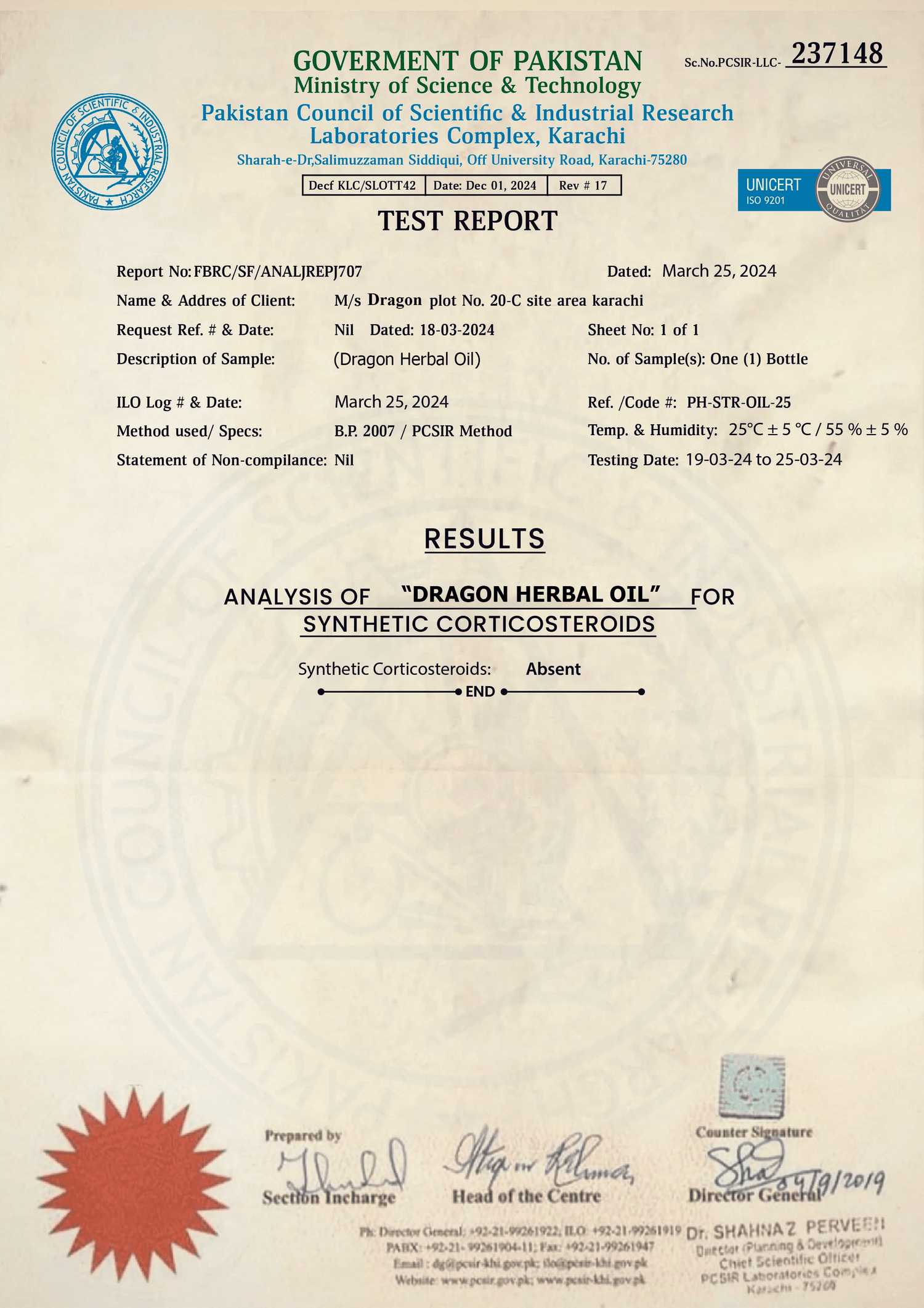 Dragon Herbal Oil has been tested by PCSIR (Pakistan Council of Scientific & Industrial Research) and verified to be free from synthetic corticosteroids and harmful chemicals. Each batch meets the highest national quality and safety standards. - Safe for Daily Use